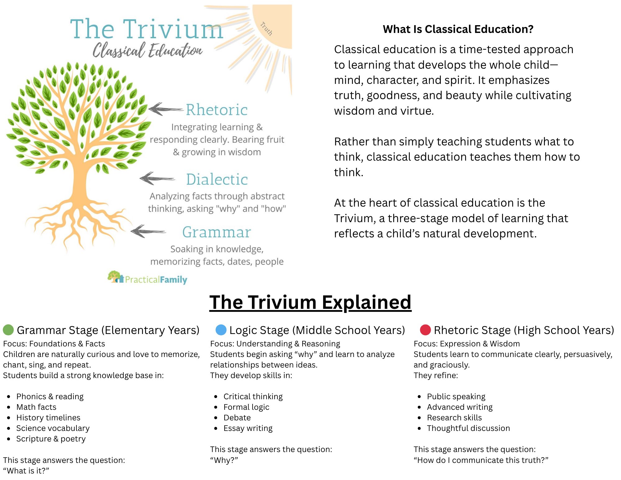 Through the Classical methodology, which seeks to train children in mind, body, and spirit, teachers educate students through three stages: grammar, logic, and rhetoric.