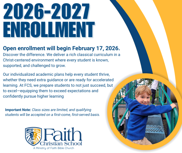 Faith Christian School strives to provide a Classical education in a Christ-centered environment. Exceptional students, both struggling and gifted, are given an academic plan that will challenge and encourage success. Our goal is to equip every student academically so he or she will not only succeed but will exceed expectations in the realms of higher learning.